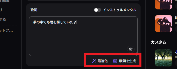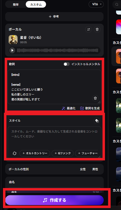 上の画像の赤枠部分に歌詞とスタイルを入力して、作成するボタンを押すだけです。