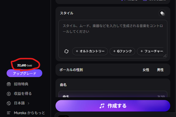 こういうサービスは有料版にすると比較的無制限でサービス使えるケースが多いのですが、Murekaは生成する度にGoldというのを消費します。