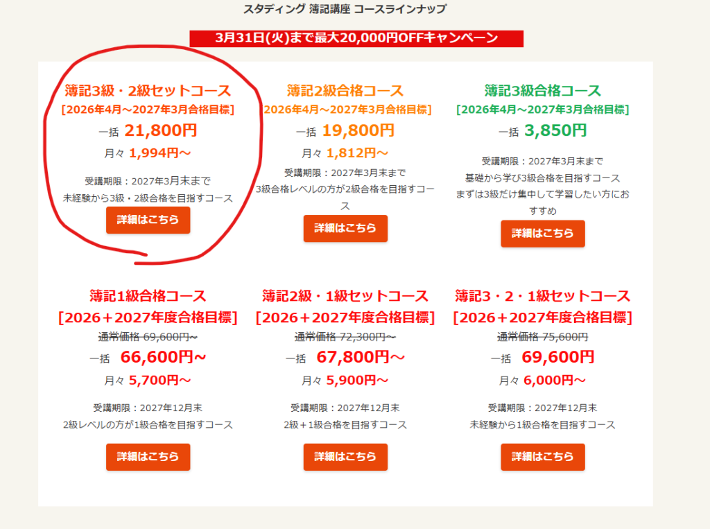 簿記2級+3級パックがあるので、コストを抑えながら両方の級の合格を狙えます。